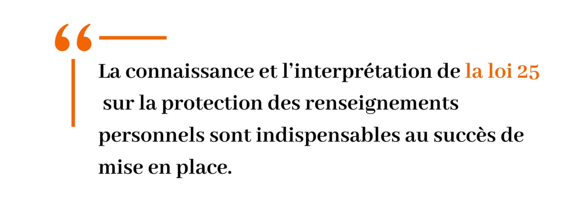 Plusieurs autres éléments sont aussi à considérer tel que la communication hors Québec, entente avec fournisseurs tiers, dépersonnalisation des données et la traçabilité. Pour comprendre son l’implication, l’organisation devra faire une analyse de sa situation et faire un plan d’action en conséquence. La connaissance et l’interprétation de la loi 25 sur la protection des renseignements personnels sont indispensables au succès de mise en place.